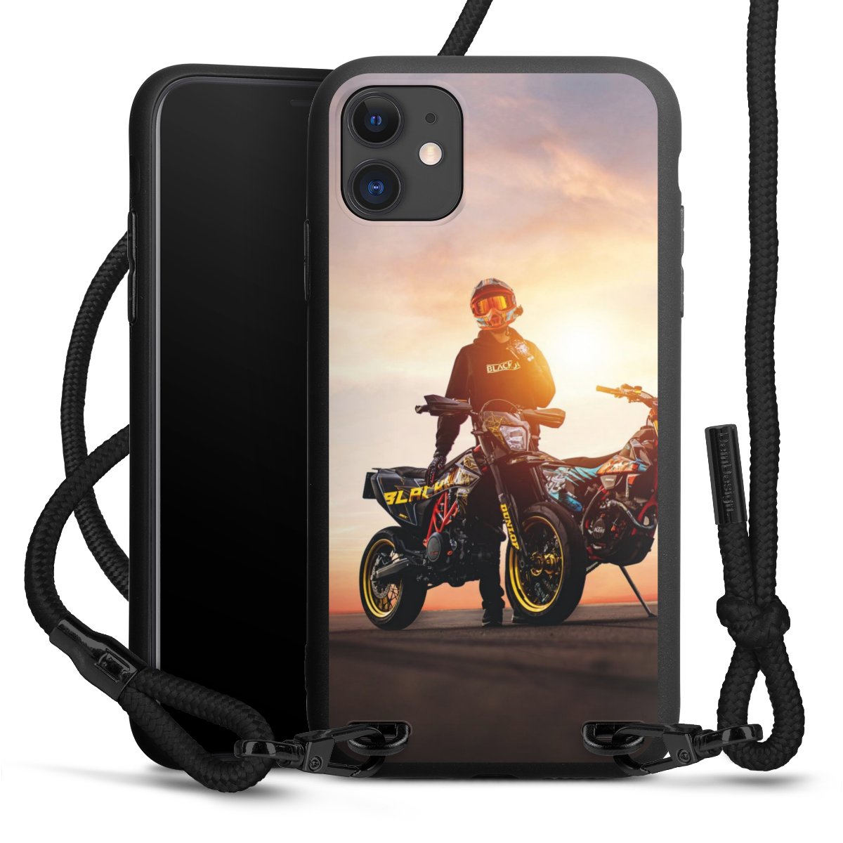 Pure Black: Handyhülle, Stoffband und Metalldetails in stylischem Mattschwarz.