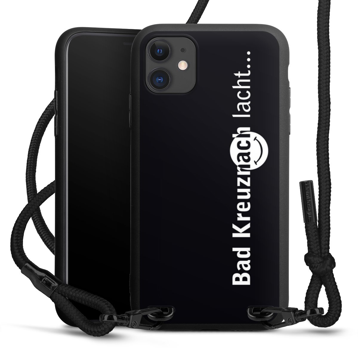 Pure Black: Handyhülle, Stoffband und Metalldetails in stylischem Mattschwarz.