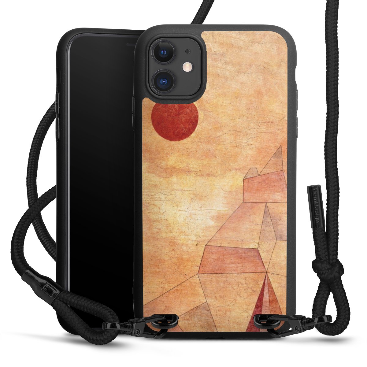 Pure Black: Handyhülle, Stoffband und Metalldetails in stylischem Mattschwarz.
