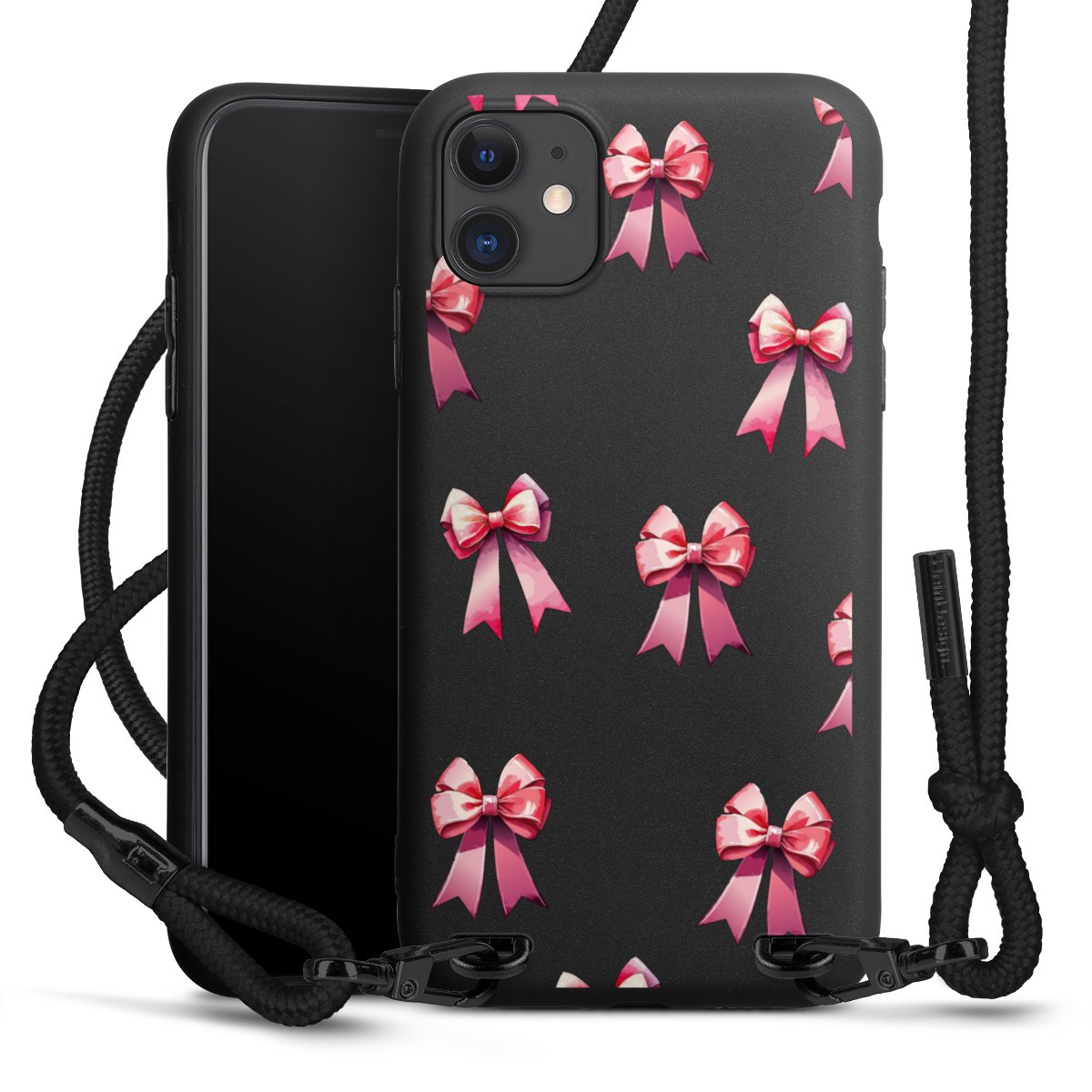Pure Black: Handyhülle, Stoffband und Metalldetails in stylischem Mattschwarz.