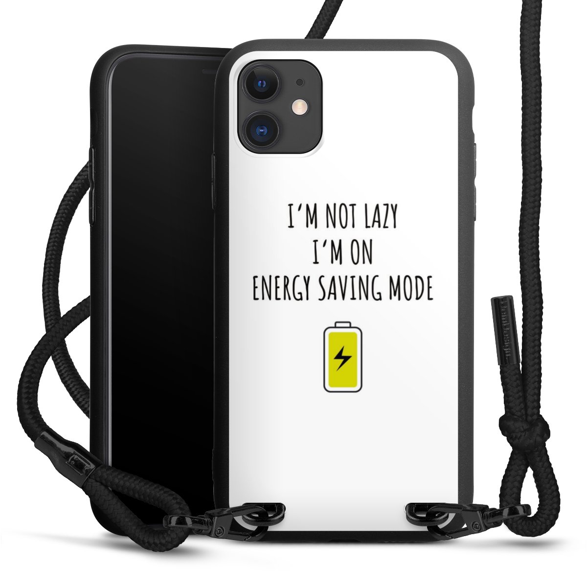Pure Black: Handyhülle, Stoffband und Metalldetails in stylischem Mattschwarz.