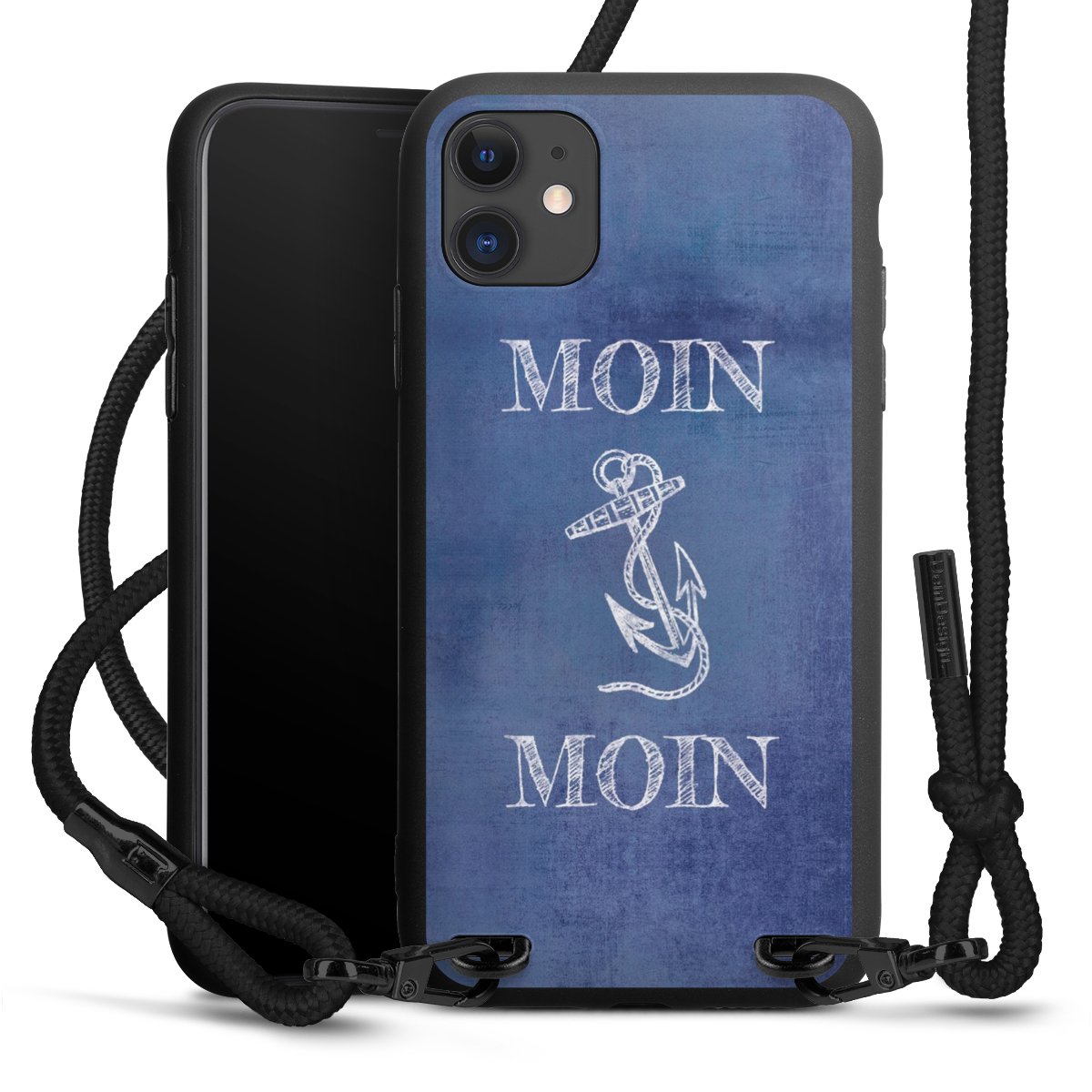 Pure Black: Handyhülle, Stoffband und Metalldetails in stylischem Mattschwarz.
