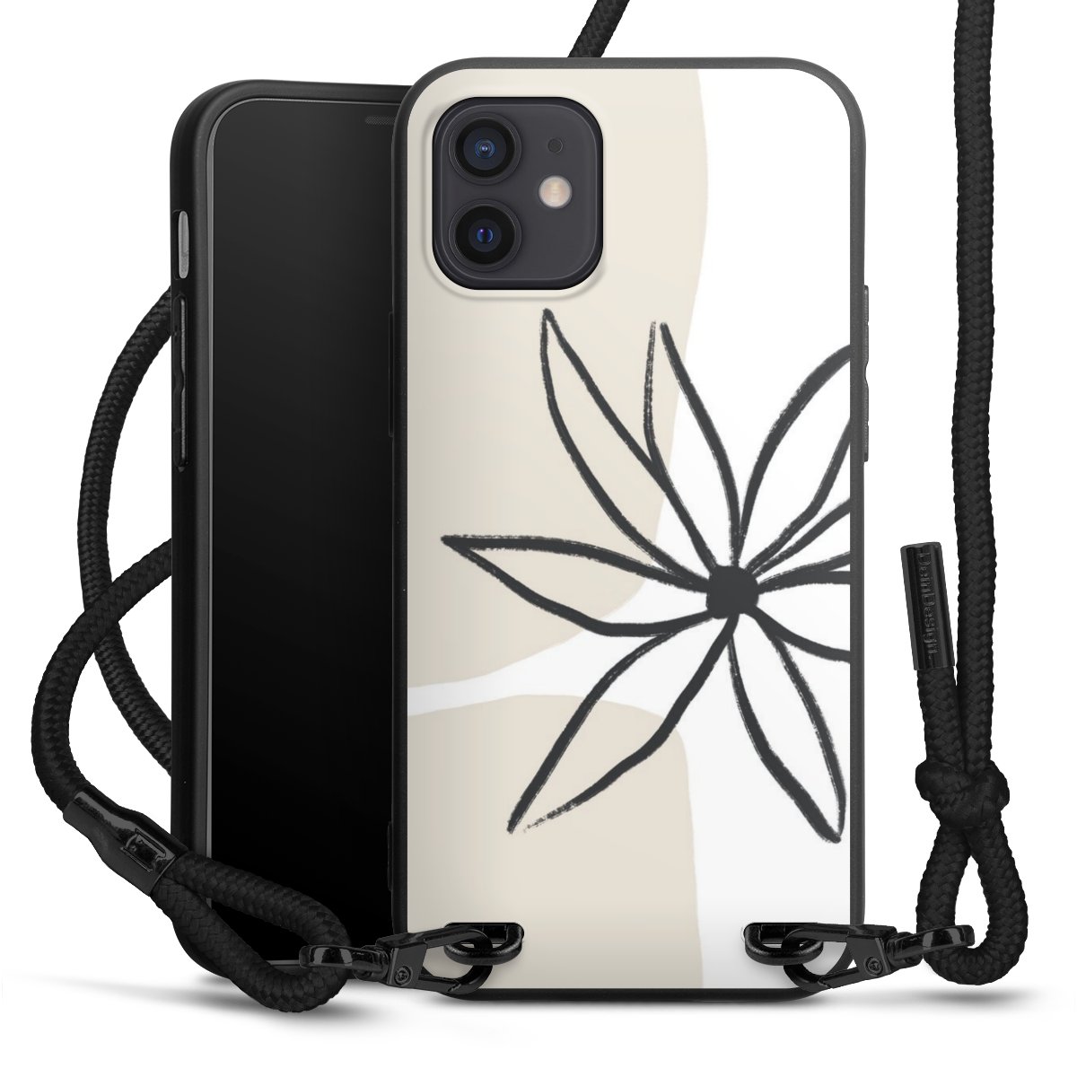 Pure Black: Handyhülle, Stoffband und Metalldetails in stylischem Mattschwarz.