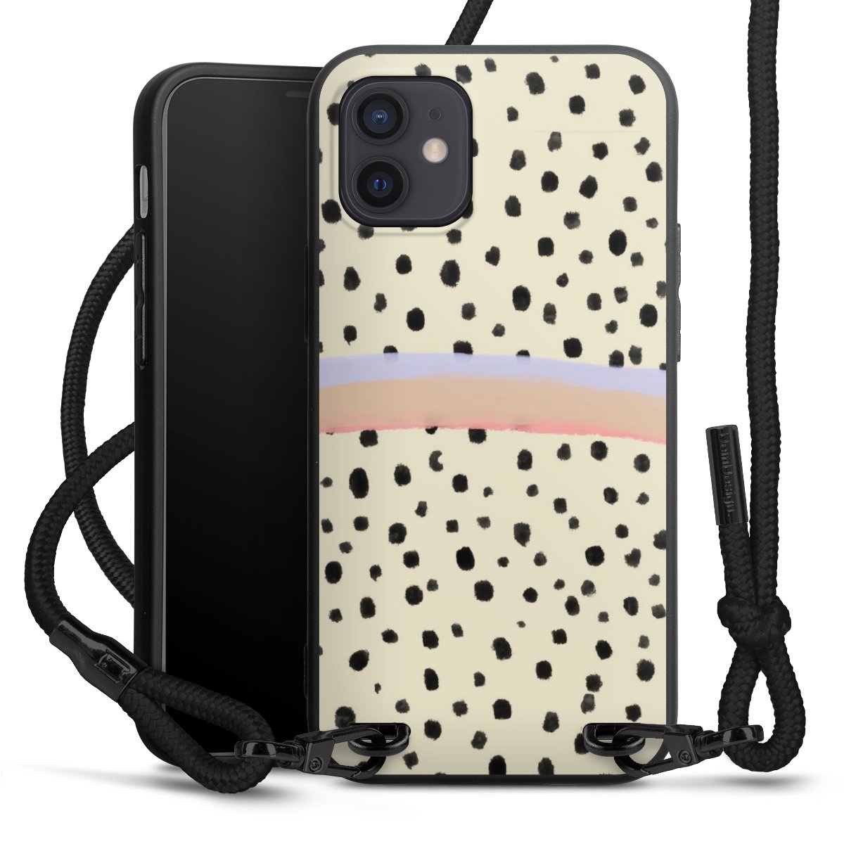 Pure Black: Handyhülle, Stoffband und Metalldetails in stylischem Mattschwarz.