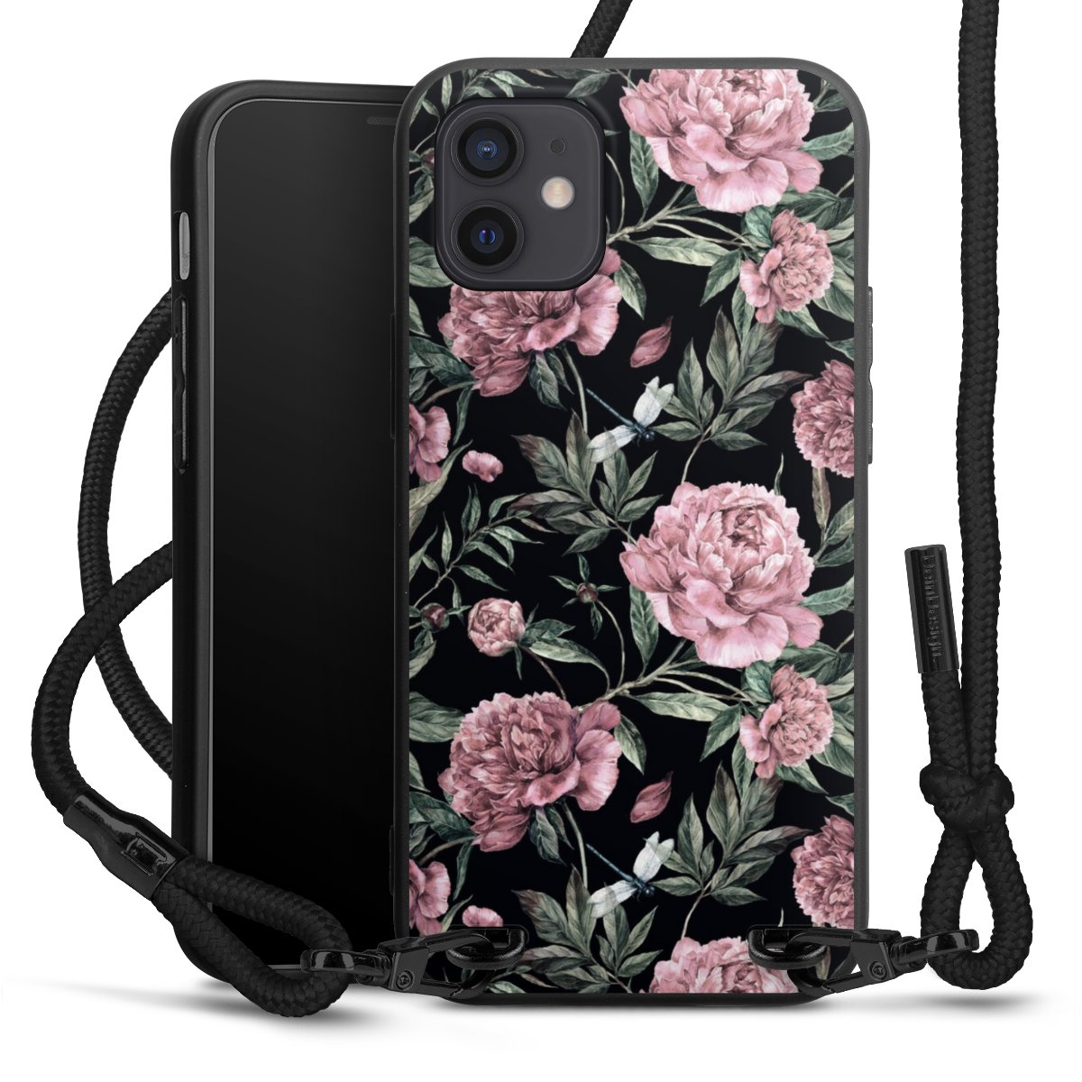 Pure Black: Handyhülle, Stoffband und Metalldetails in stylischem Mattschwarz.