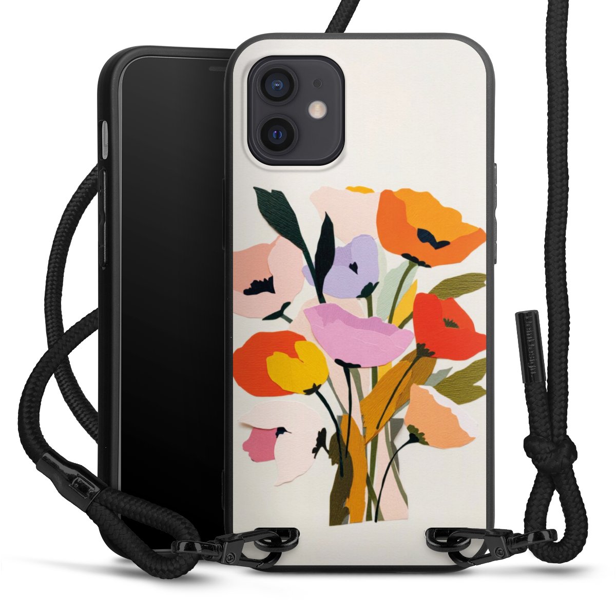 Pure Black: Handyhülle, Stoffband und Metalldetails in stylischem Mattschwarz.