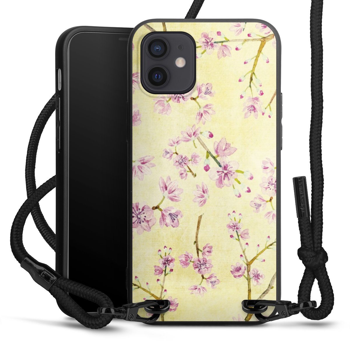 Pure Black: Handyhülle, Stoffband und Metalldetails in stylischem Mattschwarz.