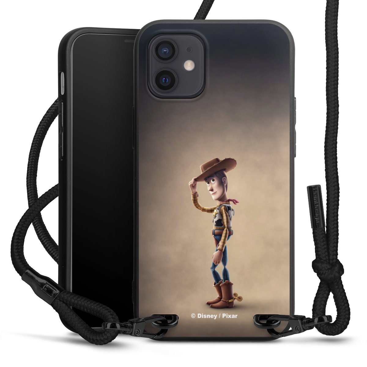 Pure Black: Handyhülle, Stoffband und Metalldetails in stylischem Mattschwarz.