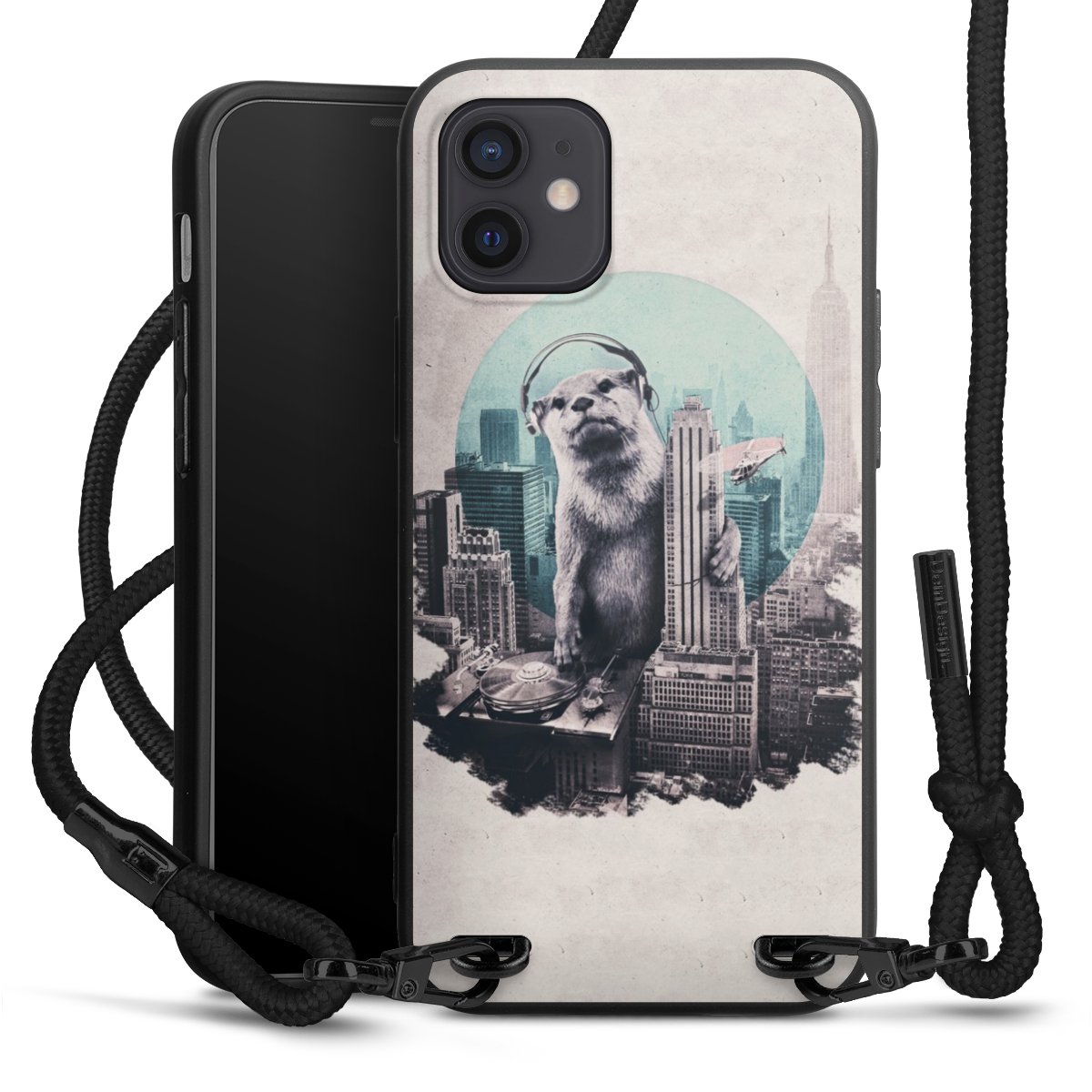 Pure Black: Handyhülle, Stoffband und Metalldetails in stylischem Mattschwarz.