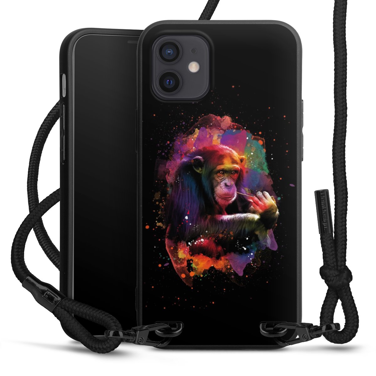 Pure Black: Handyhülle, Stoffband und Metalldetails in stylischem Mattschwarz.