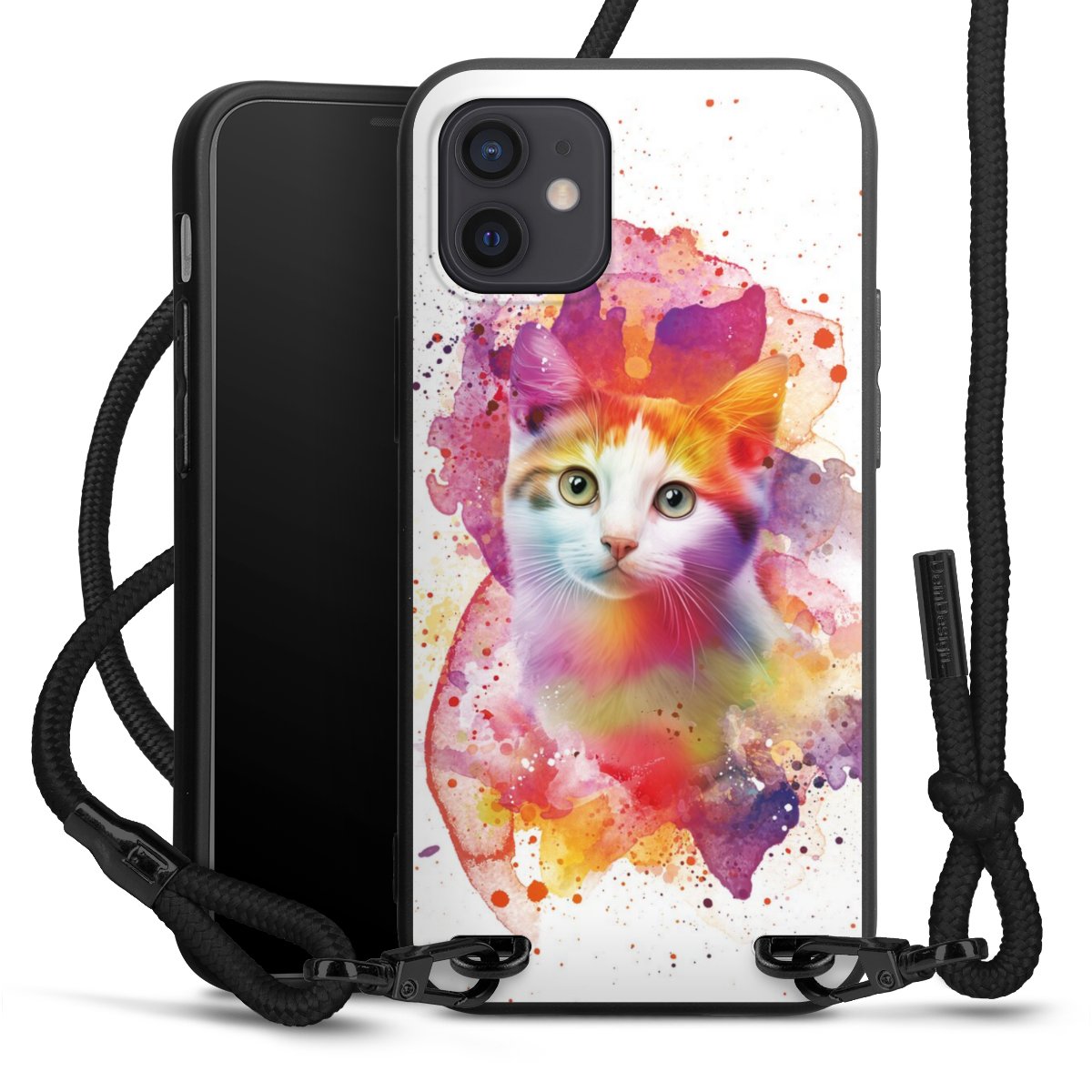 Pure Black: Handyhülle, Stoffband und Metalldetails in stylischem Mattschwarz.