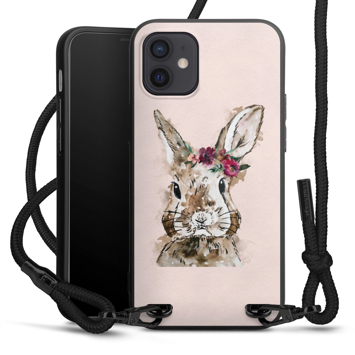 Pure Black: Handyhülle, Stoffband und Metalldetails in stylischem Mattschwarz.