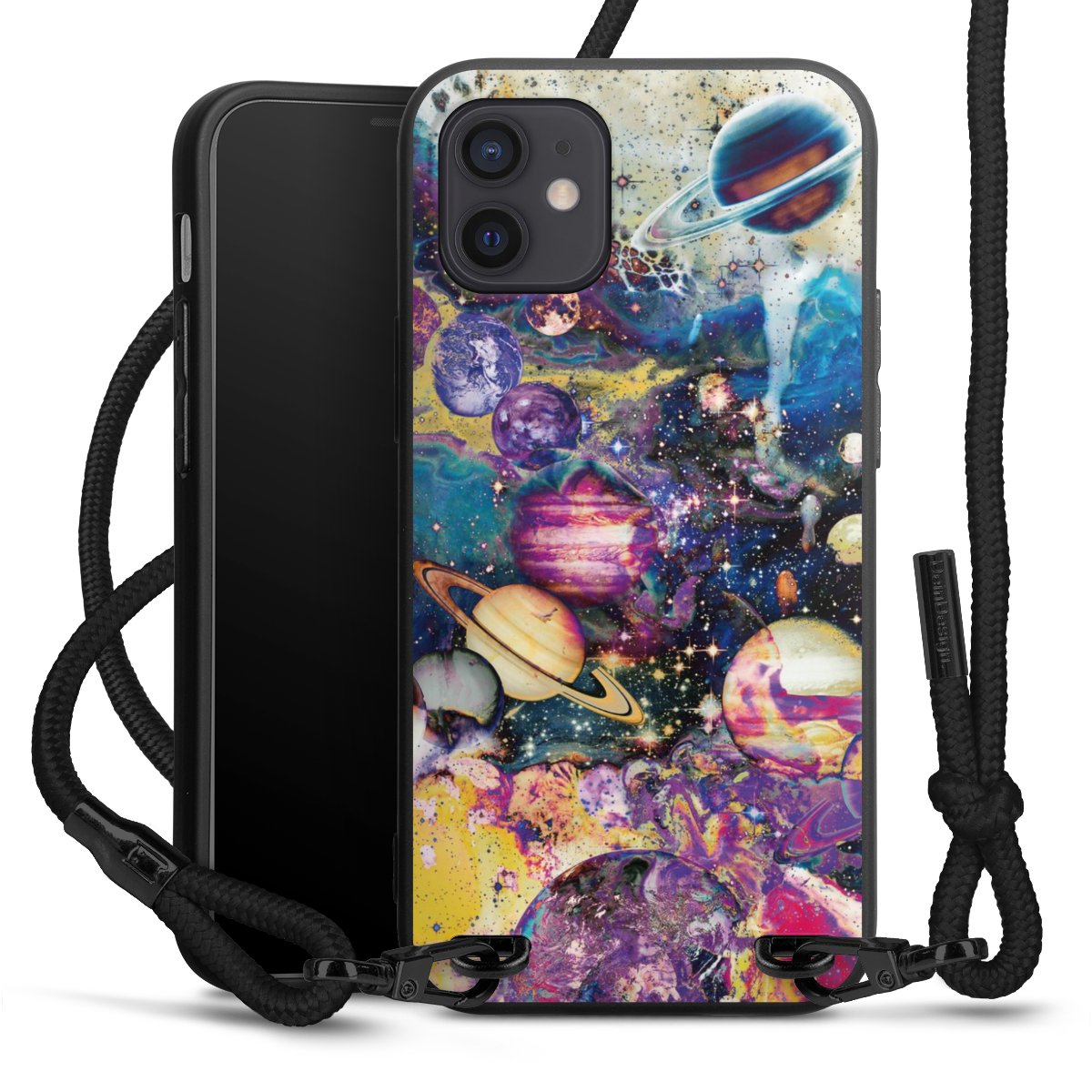 Pure Black: Handyhülle, Stoffband und Metalldetails in stylischem Mattschwarz.