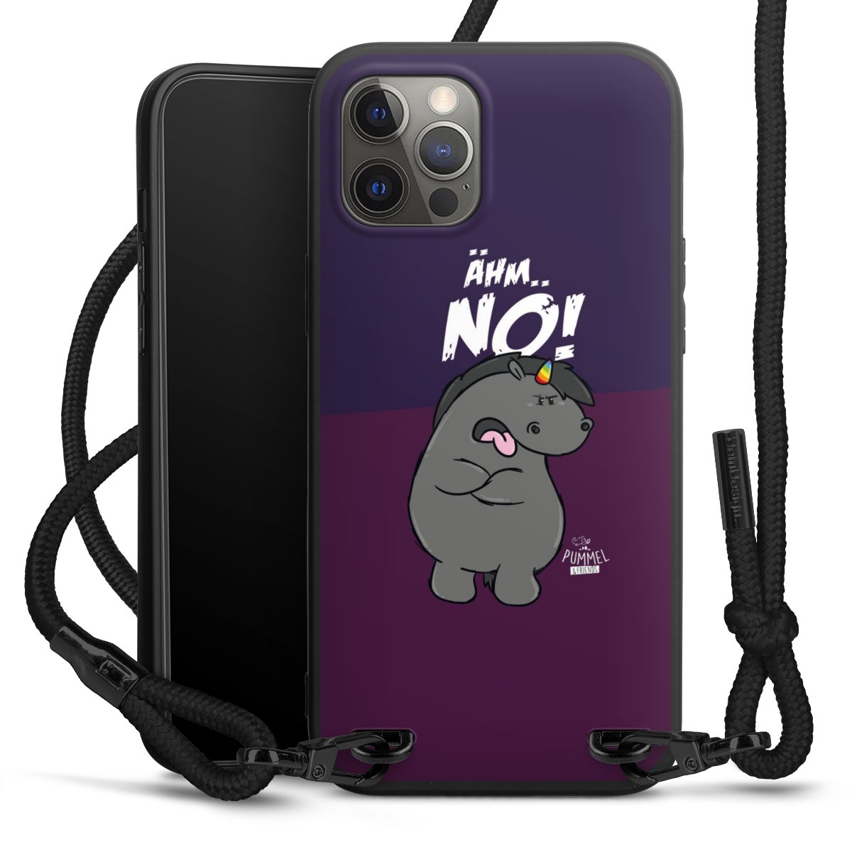 Pure Black: Handyhülle, Stoffband und Metalldetails in stylischem Mattschwarz.