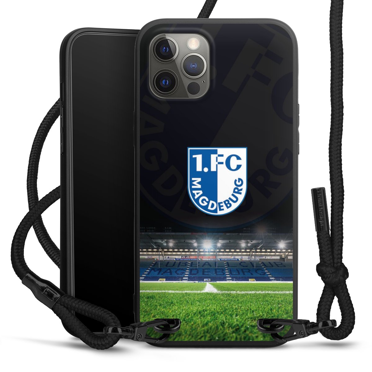 Pure Black: Handyhülle, Stoffband und Metalldetails in stylischem Mattschwarz.