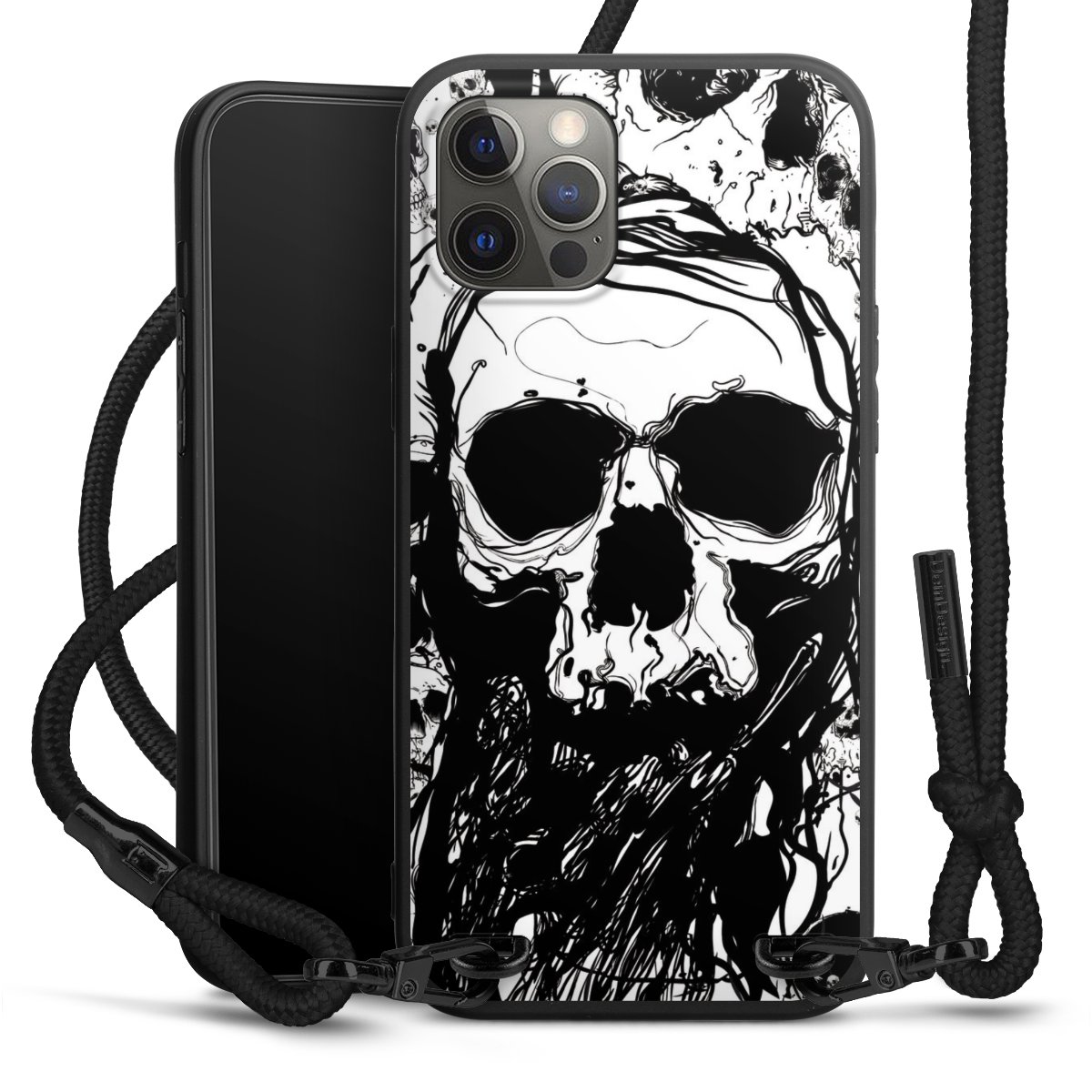 Pure Black: Handyhülle, Stoffband und Metalldetails in stylischem Mattschwarz.