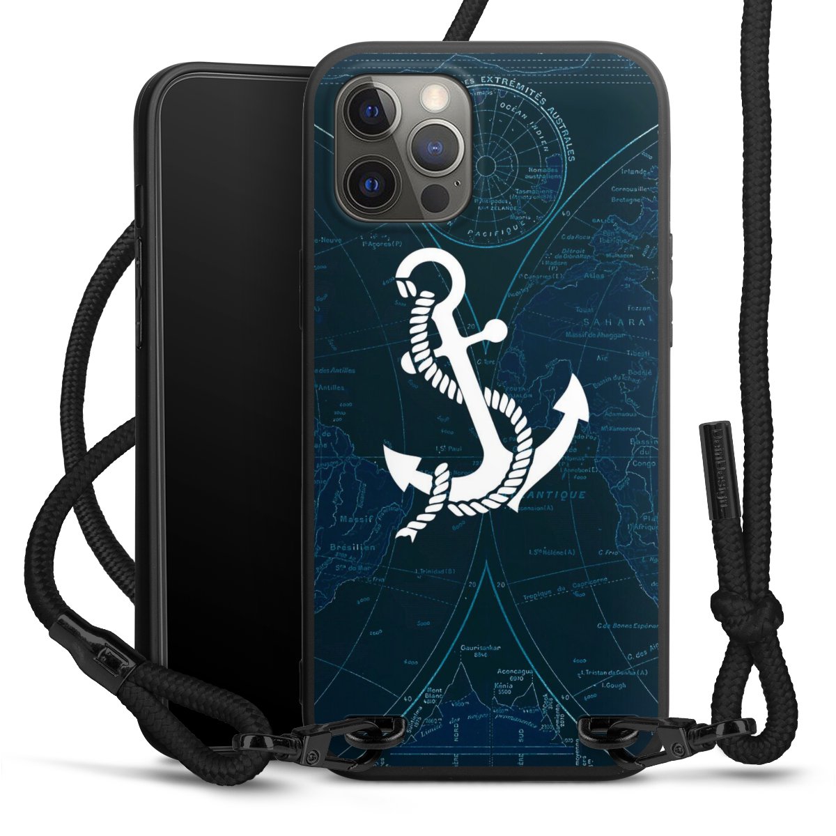 Pure Black: Handyhülle, Stoffband und Metalldetails in stylischem Mattschwarz.