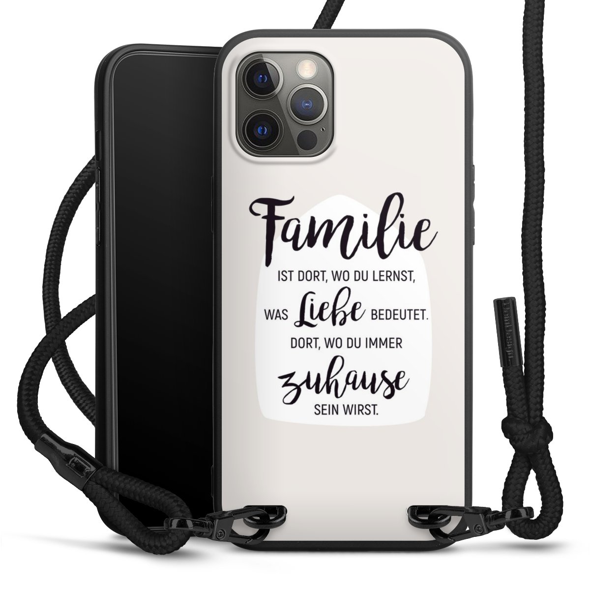 Pure Black: Handyhülle, Stoffband und Metalldetails in stylischem Mattschwarz.