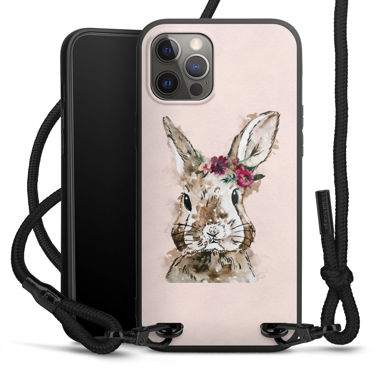 Pure Black: Handyhülle, Stoffband und Metalldetails in stylischem Mattschwarz.