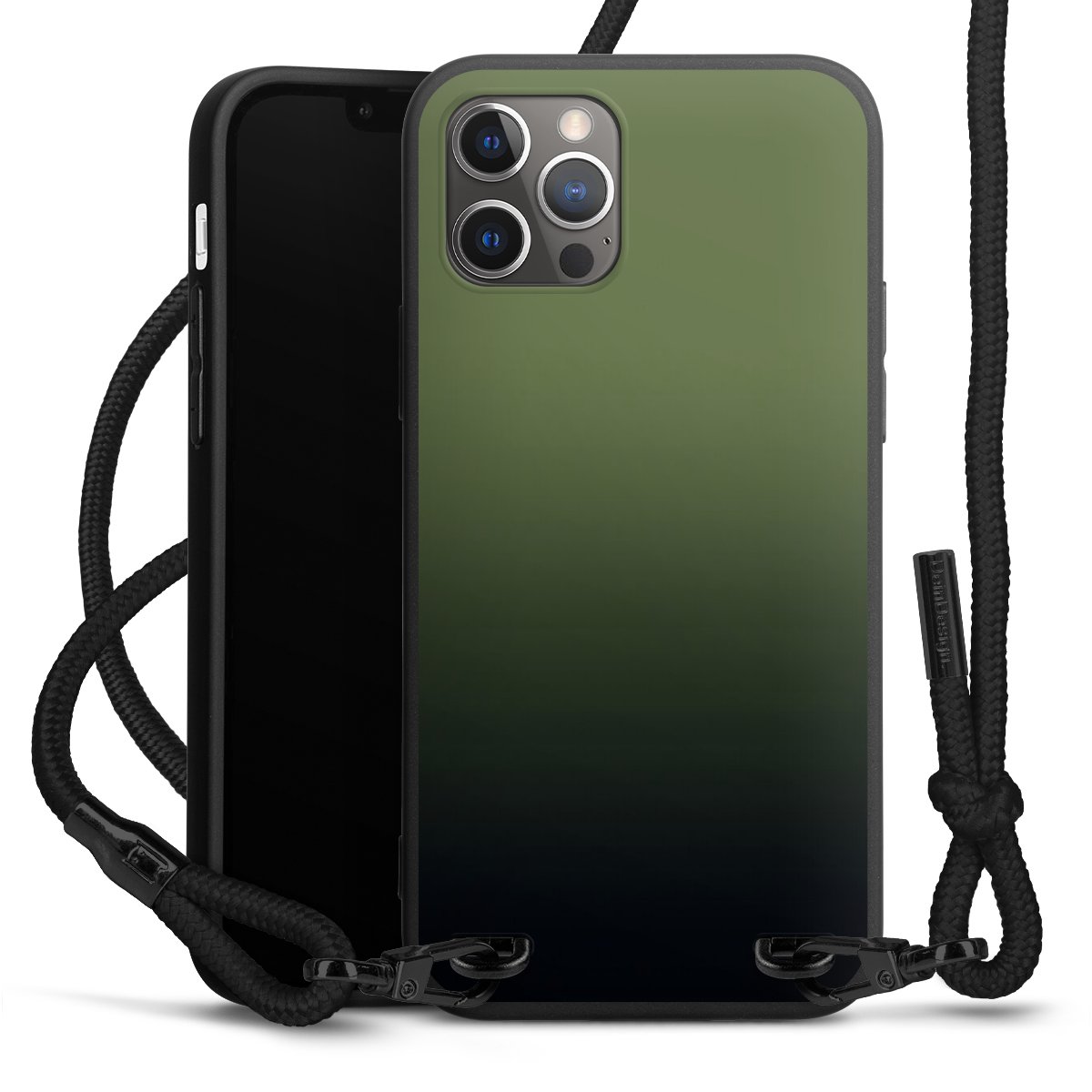 Pure Black: Handyhülle, Stoffband und Metalldetails in stylischem Mattschwarz.