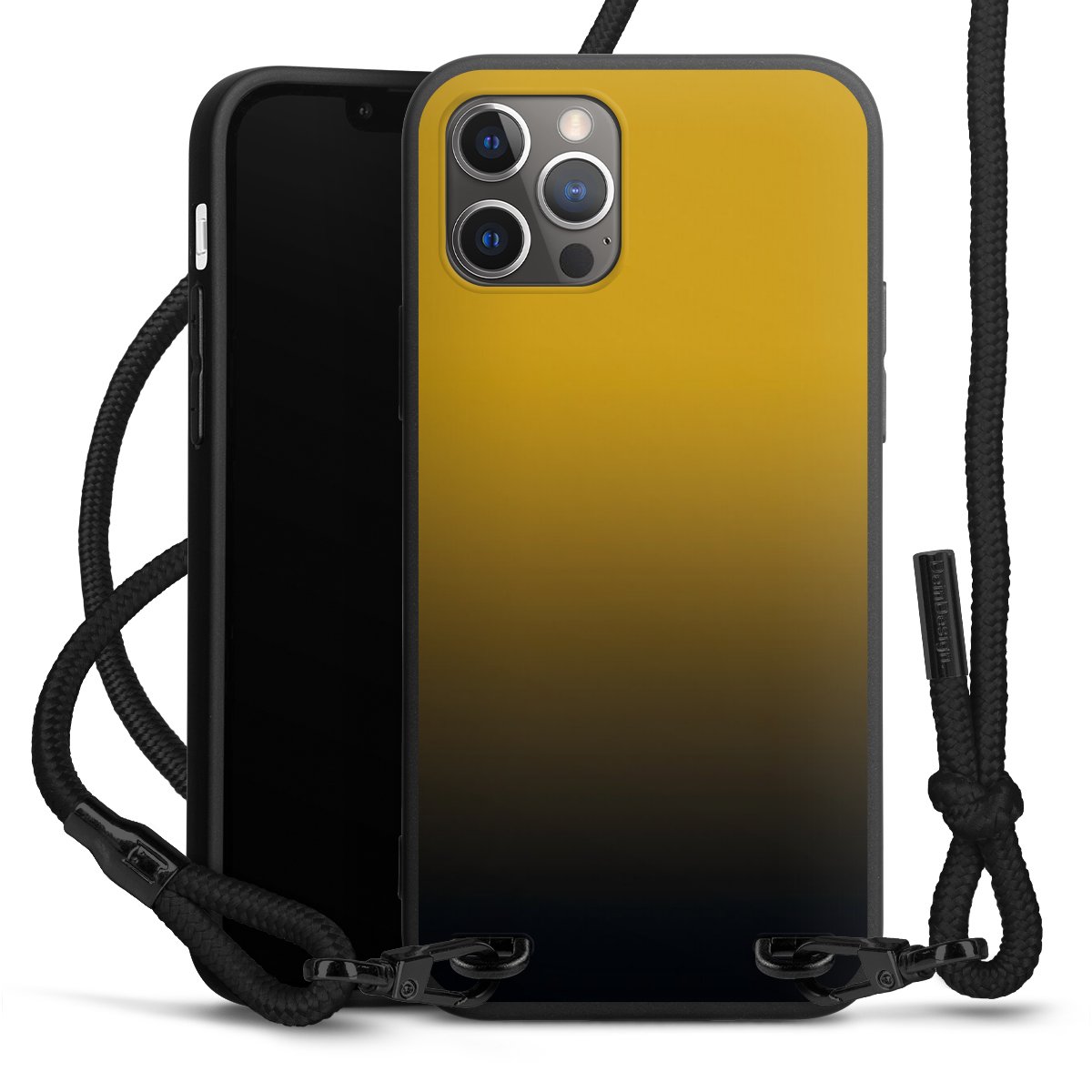 Pure Black: Handyhülle, Stoffband und Metalldetails in stylischem Mattschwarz.