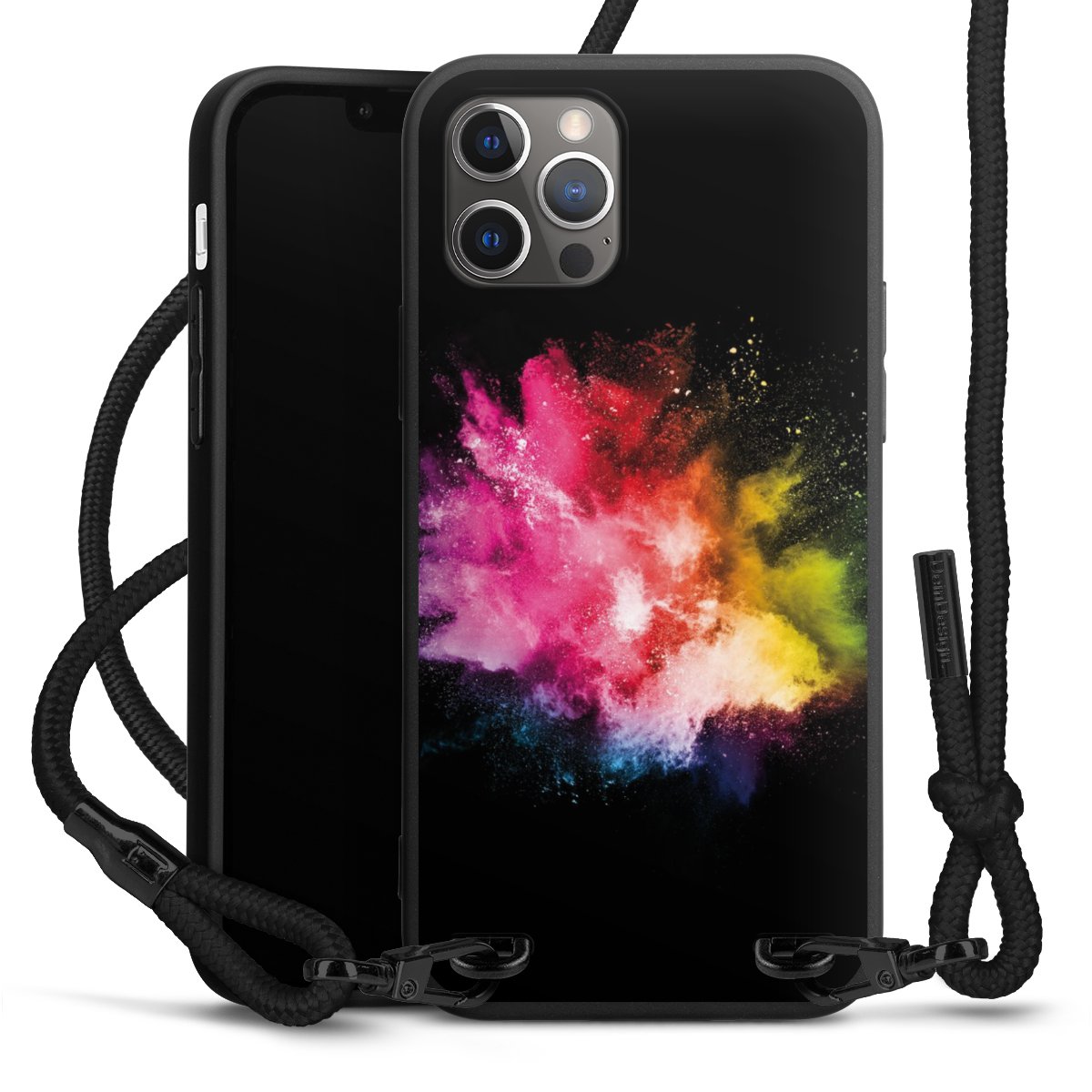 Pure Black: Handyhülle, Stoffband und Metalldetails in stylischem Mattschwarz.