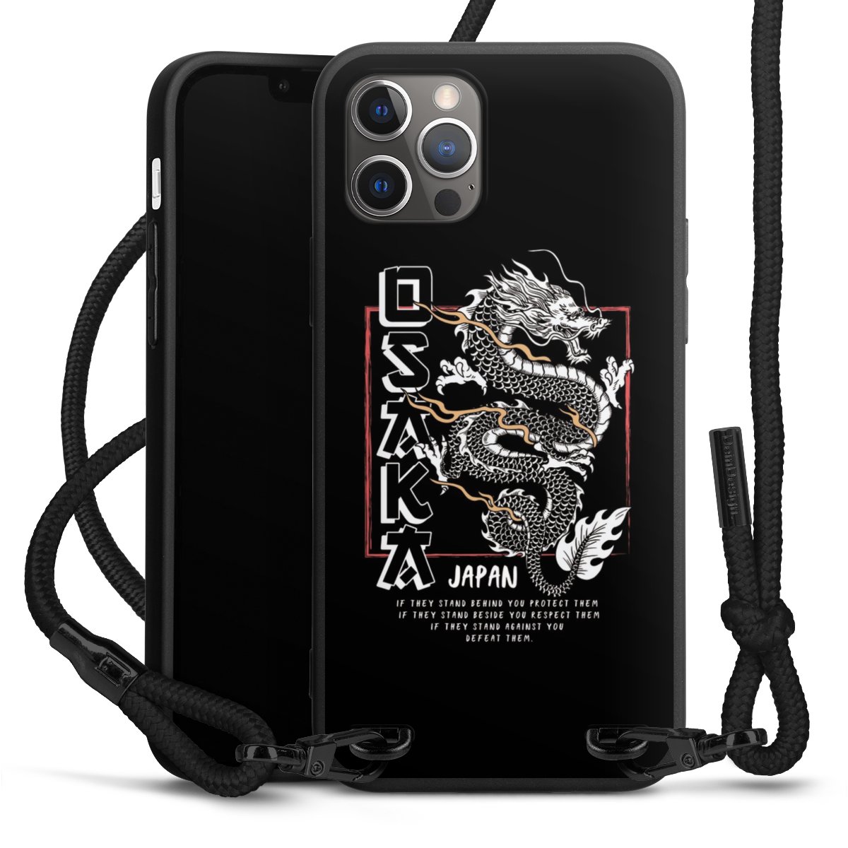 Pure Black: Handyhülle, Stoffband und Metalldetails in stylischem Mattschwarz.