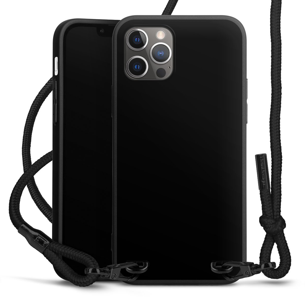 Pure Black: Handyhülle, Stoffband und Metalldetails in stylischem Mattschwarz.