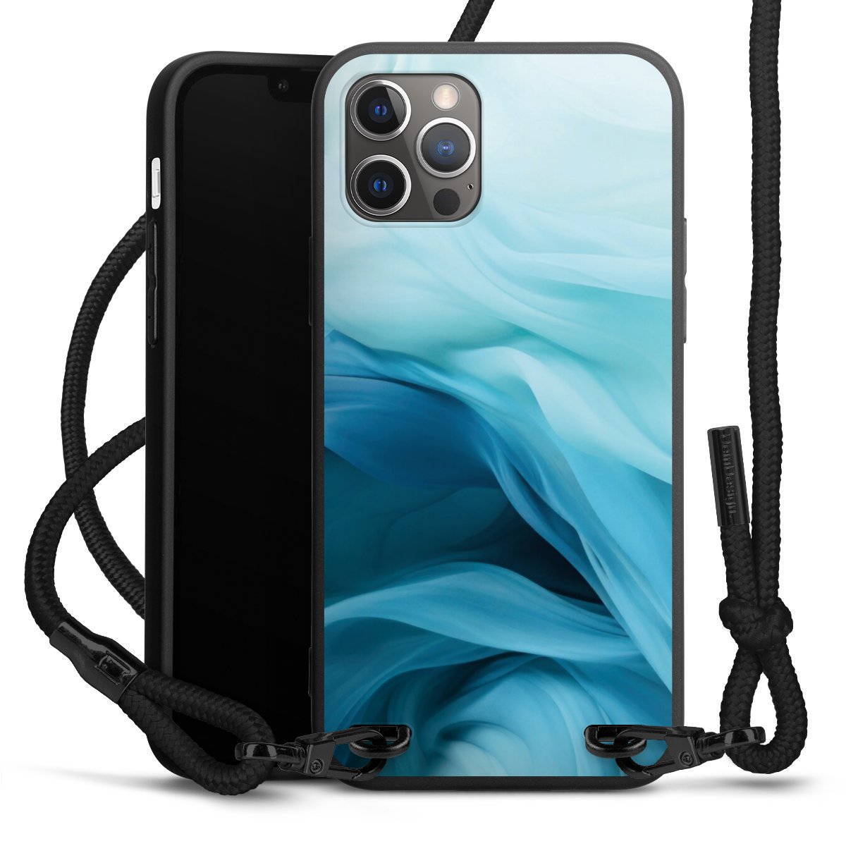 Pure Black: Handyhülle, Stoffband und Metalldetails in stylischem Mattschwarz.