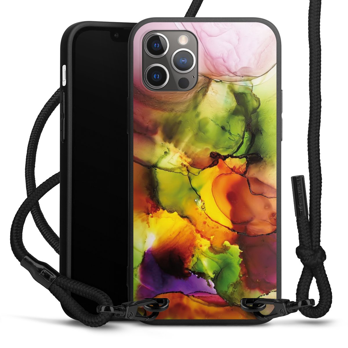 Pure Black: Handyhülle, Stoffband und Metalldetails in stylischem Mattschwarz.