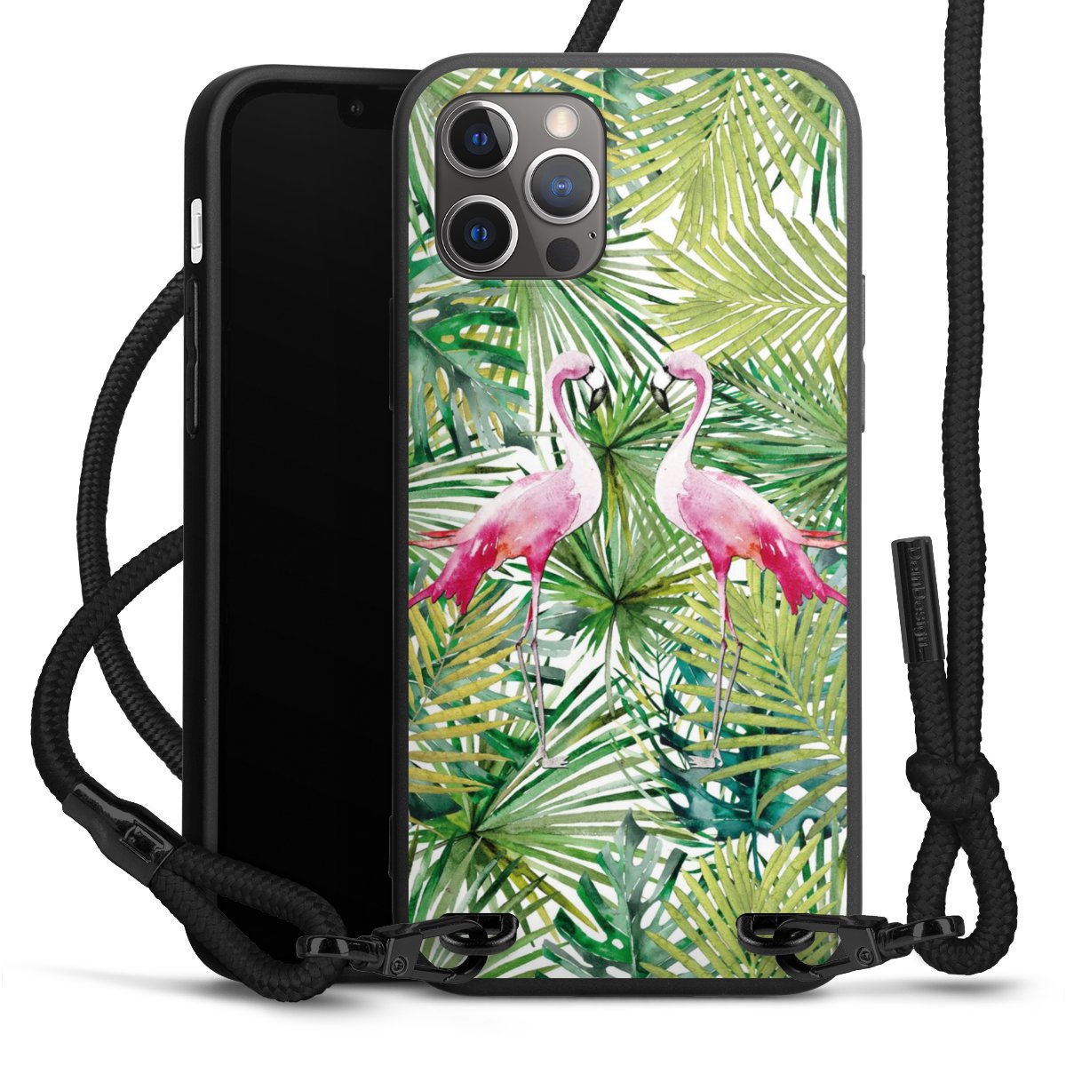 Pure Black: Handyhülle, Stoffband und Metalldetails in stylischem Mattschwarz.