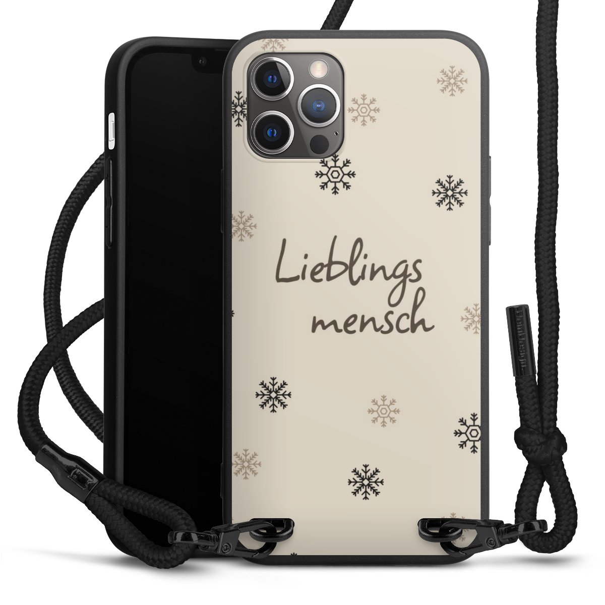 Pure Black: Handyhülle, Stoffband und Metalldetails in stylischem Mattschwarz.
