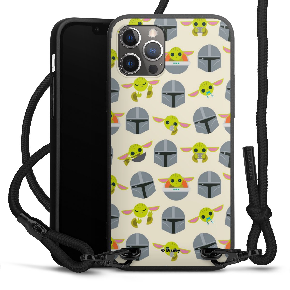 Pure Black: Handyhülle, Stoffband und Metalldetails in stylischem Mattschwarz.