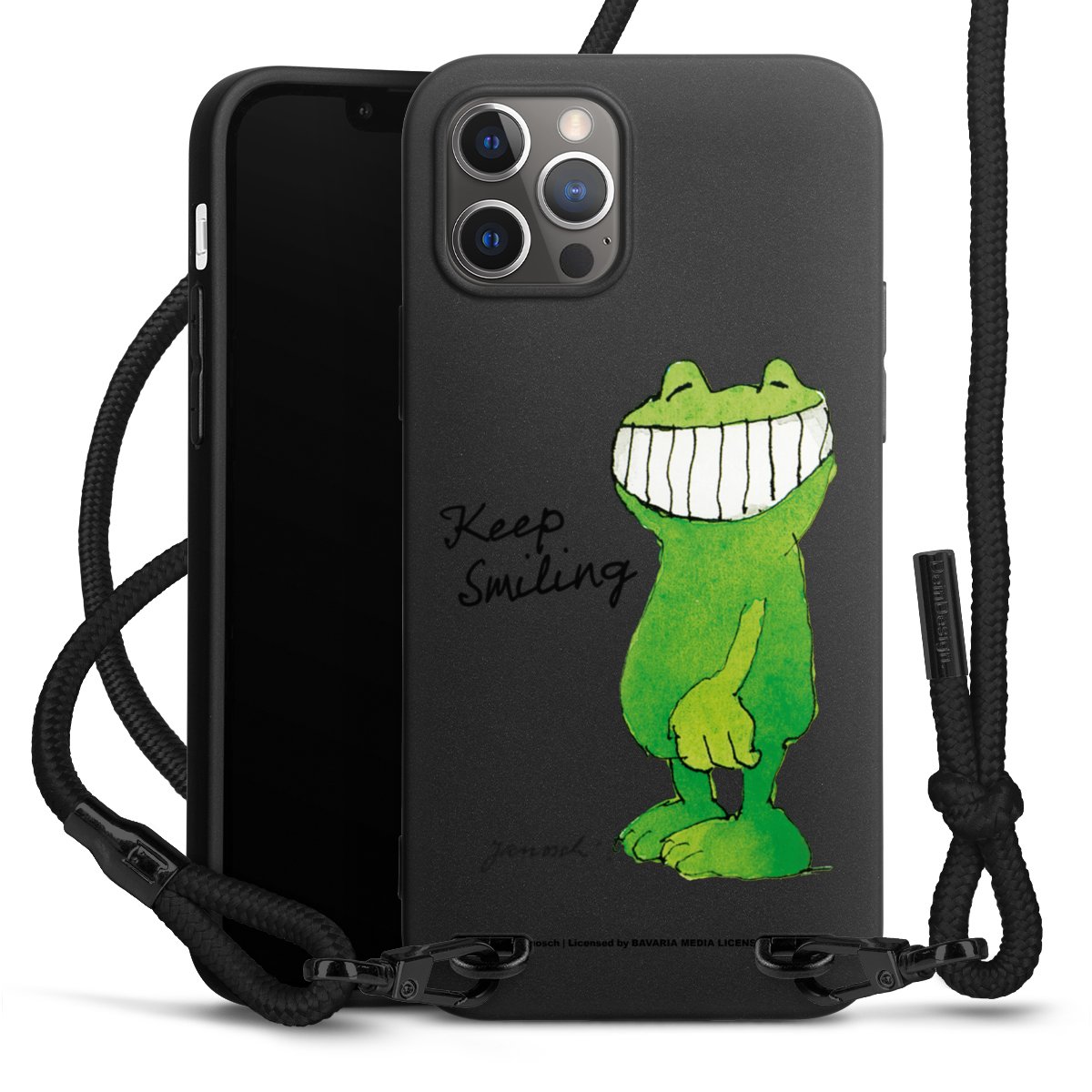 Pure Black: Handyhülle, Stoffband und Metalldetails in stylischem Mattschwarz.