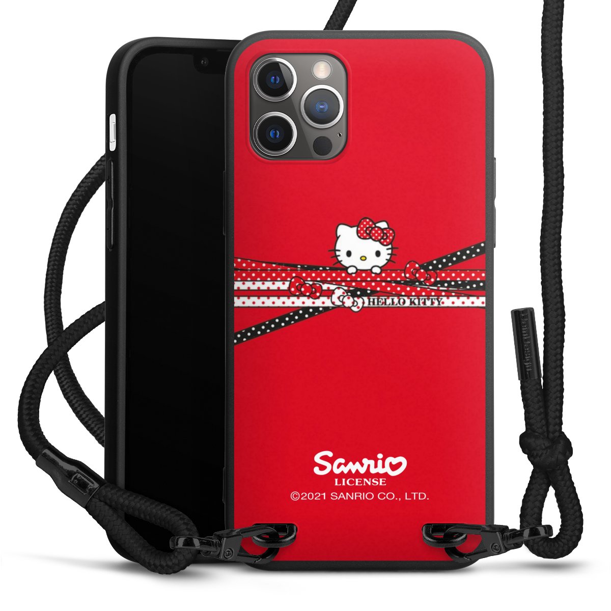 Pure Black: Handyhülle, Stoffband und Metalldetails in stylischem Mattschwarz.