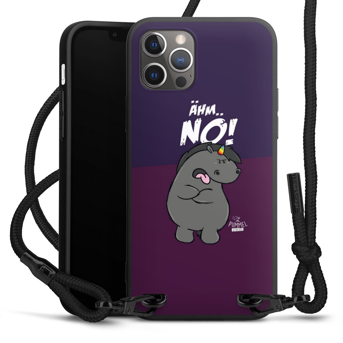 Pure Black: Handyhülle, Stoffband und Metalldetails in stylischem Mattschwarz.