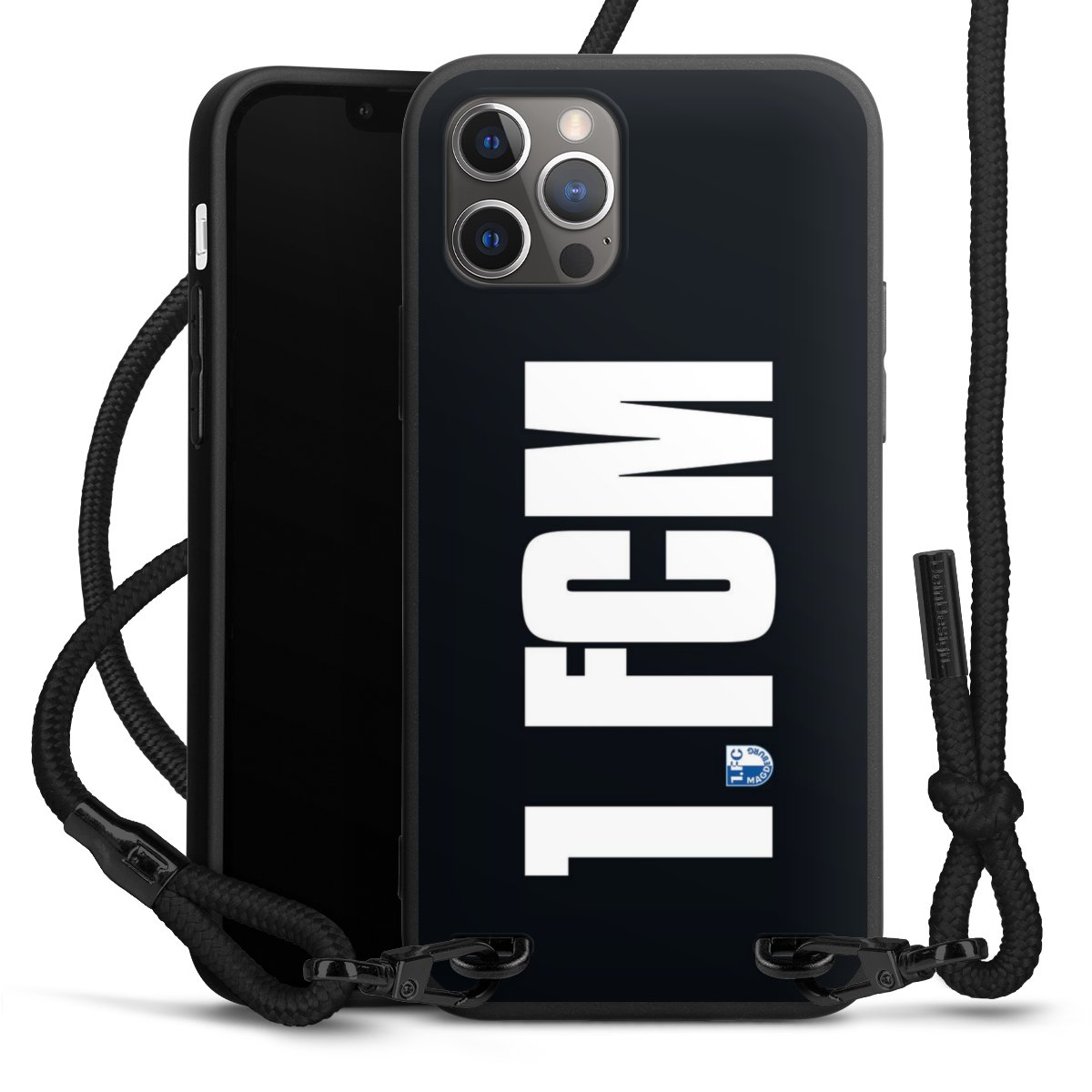 Pure Black: Handyhülle, Stoffband und Metalldetails in stylischem Mattschwarz.