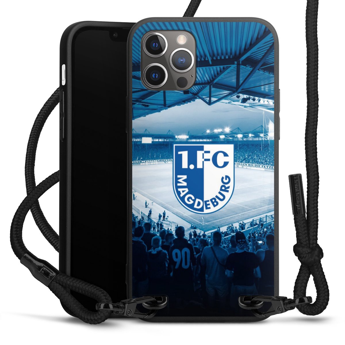 Pure Black: Handyhülle, Stoffband und Metalldetails in stylischem Mattschwarz.