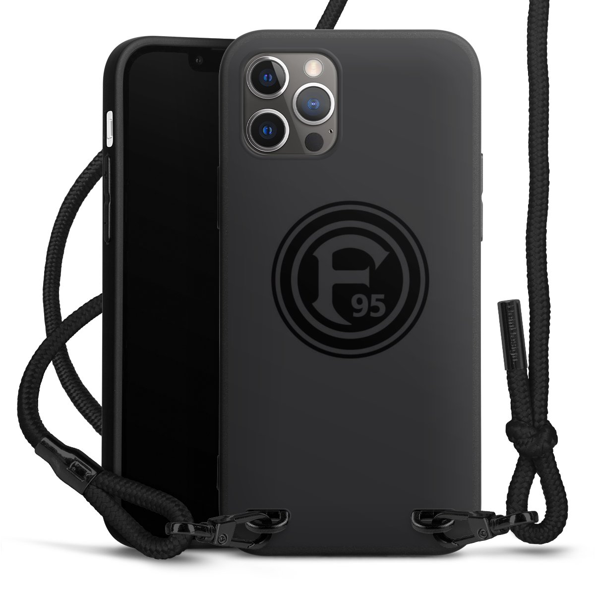 Pure Black: Handyhülle, Stoffband und Metalldetails in stylischem Mattschwarz.