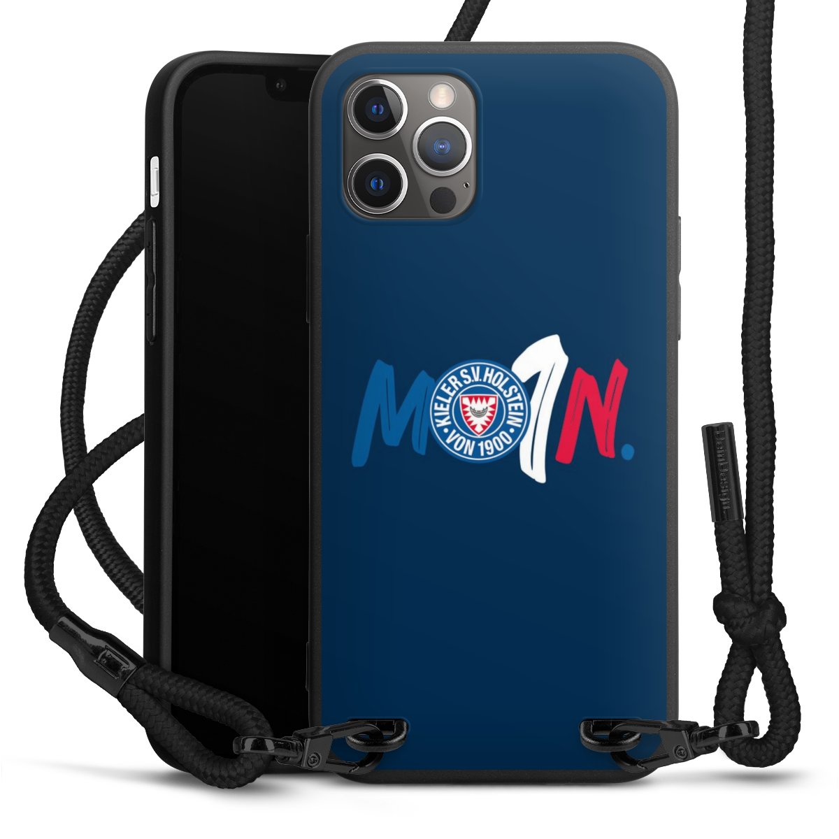 Pure Black: Handyhülle, Stoffband und Metalldetails in stylischem Mattschwarz.