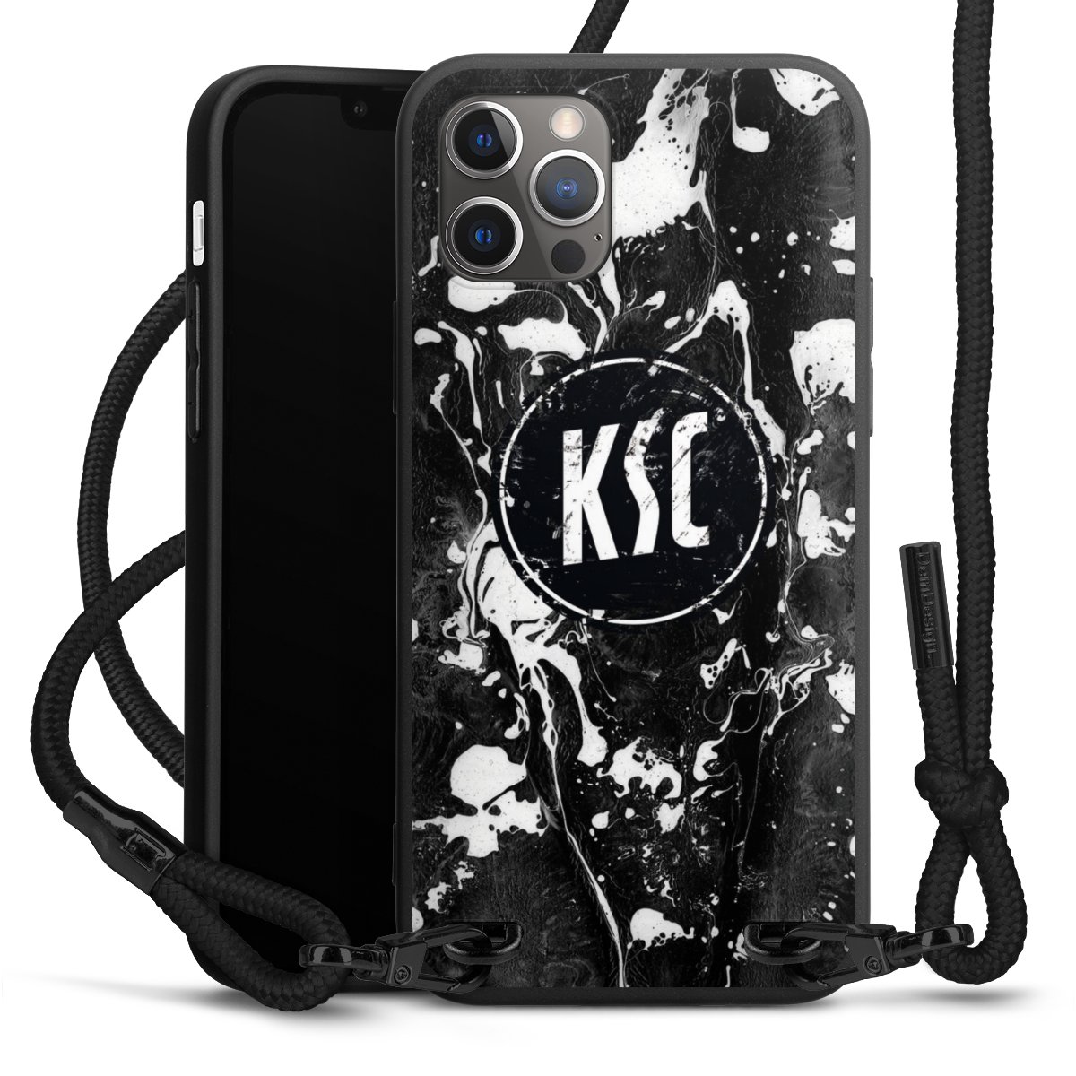 Pure Black: Handyhülle, Stoffband und Metalldetails in stylischem Mattschwarz.