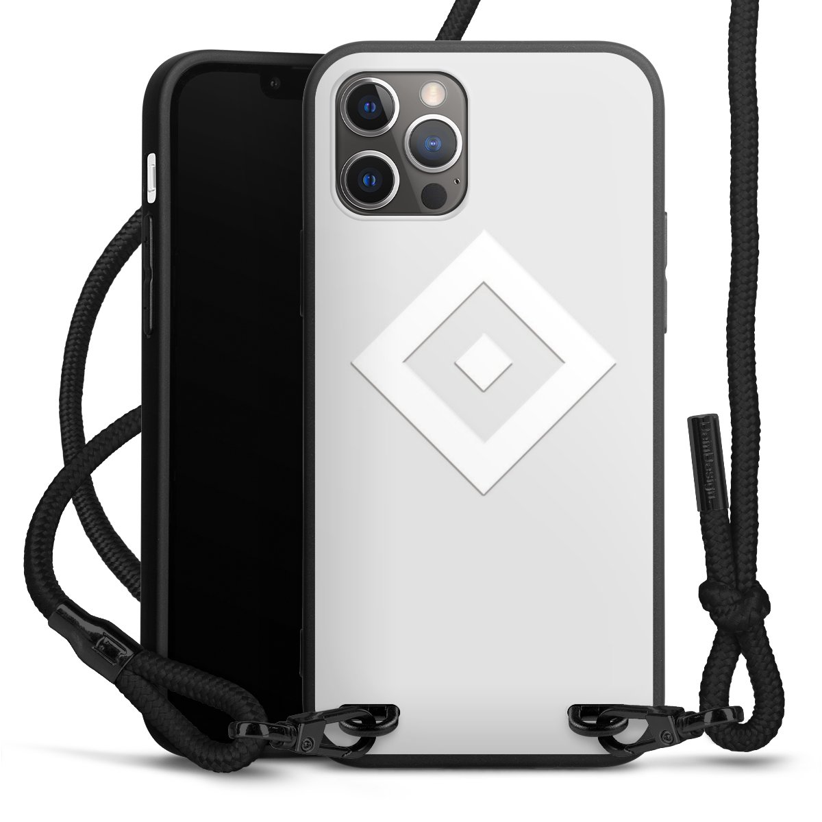 Pure Black: Handyhülle, Stoffband und Metalldetails in stylischem Mattschwarz.