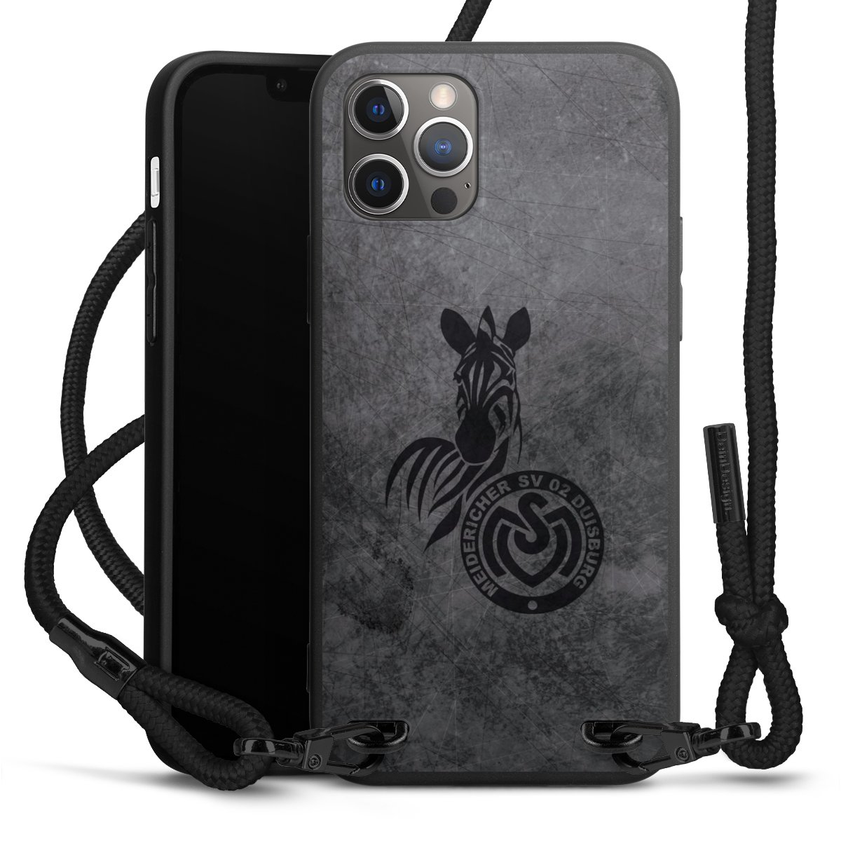 Pure Black: Handyhülle, Stoffband und Metalldetails in stylischem Mattschwarz.