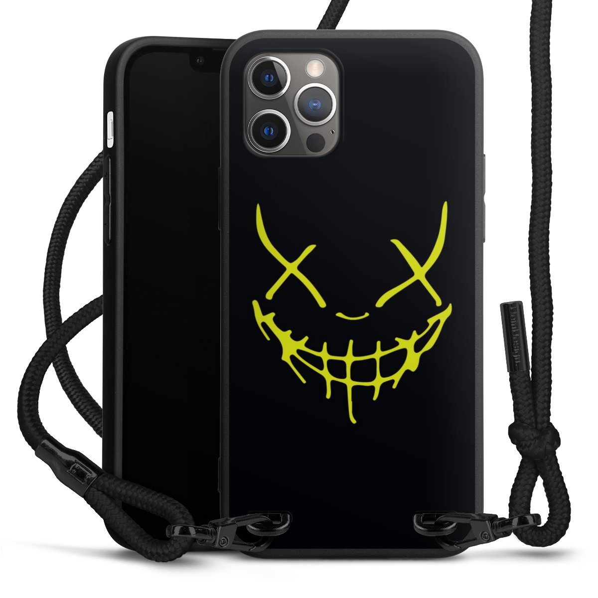 Pure Black: Handyhülle, Stoffband und Metalldetails in stylischem Mattschwarz.