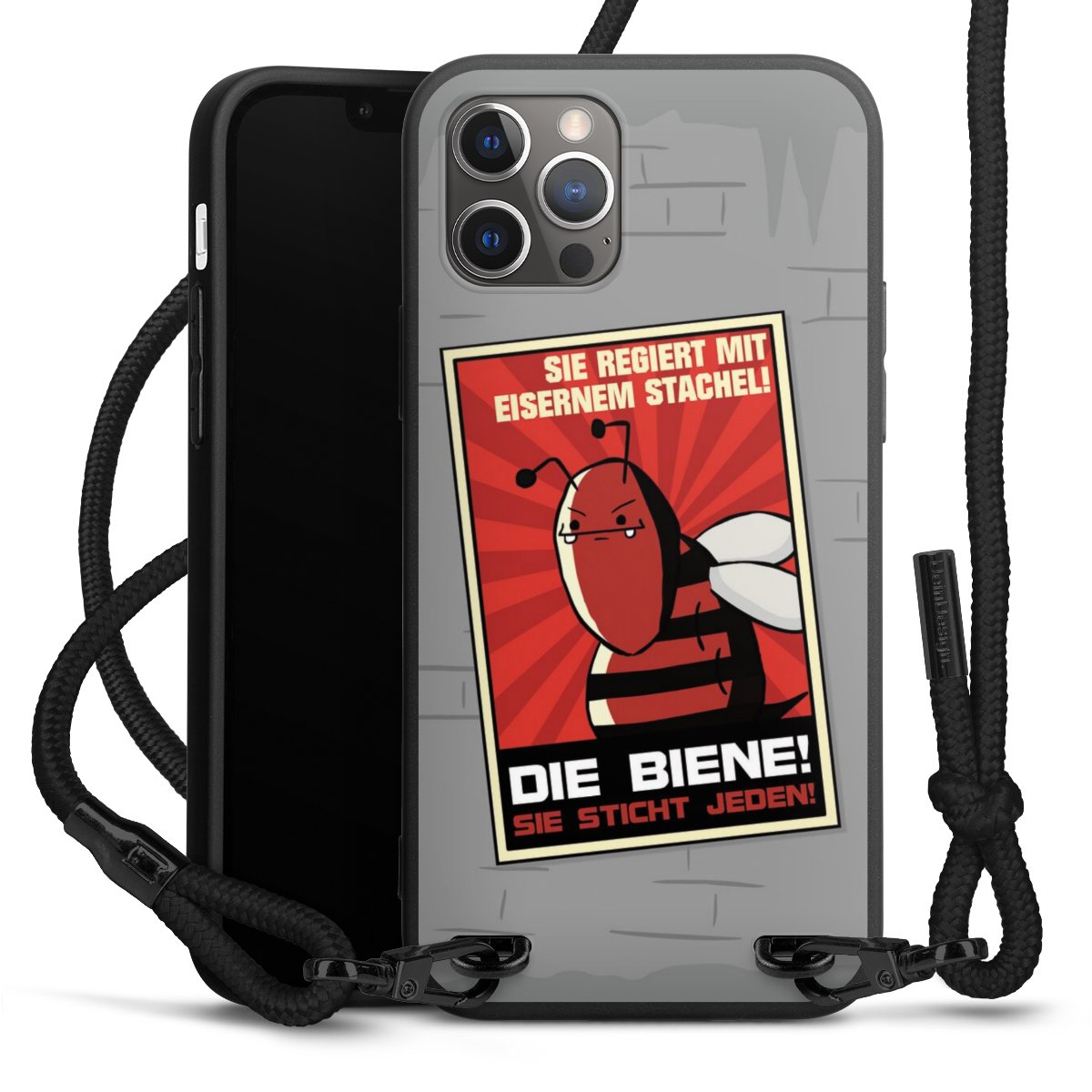 Pure Black: Handyhülle, Stoffband und Metalldetails in stylischem Mattschwarz.
