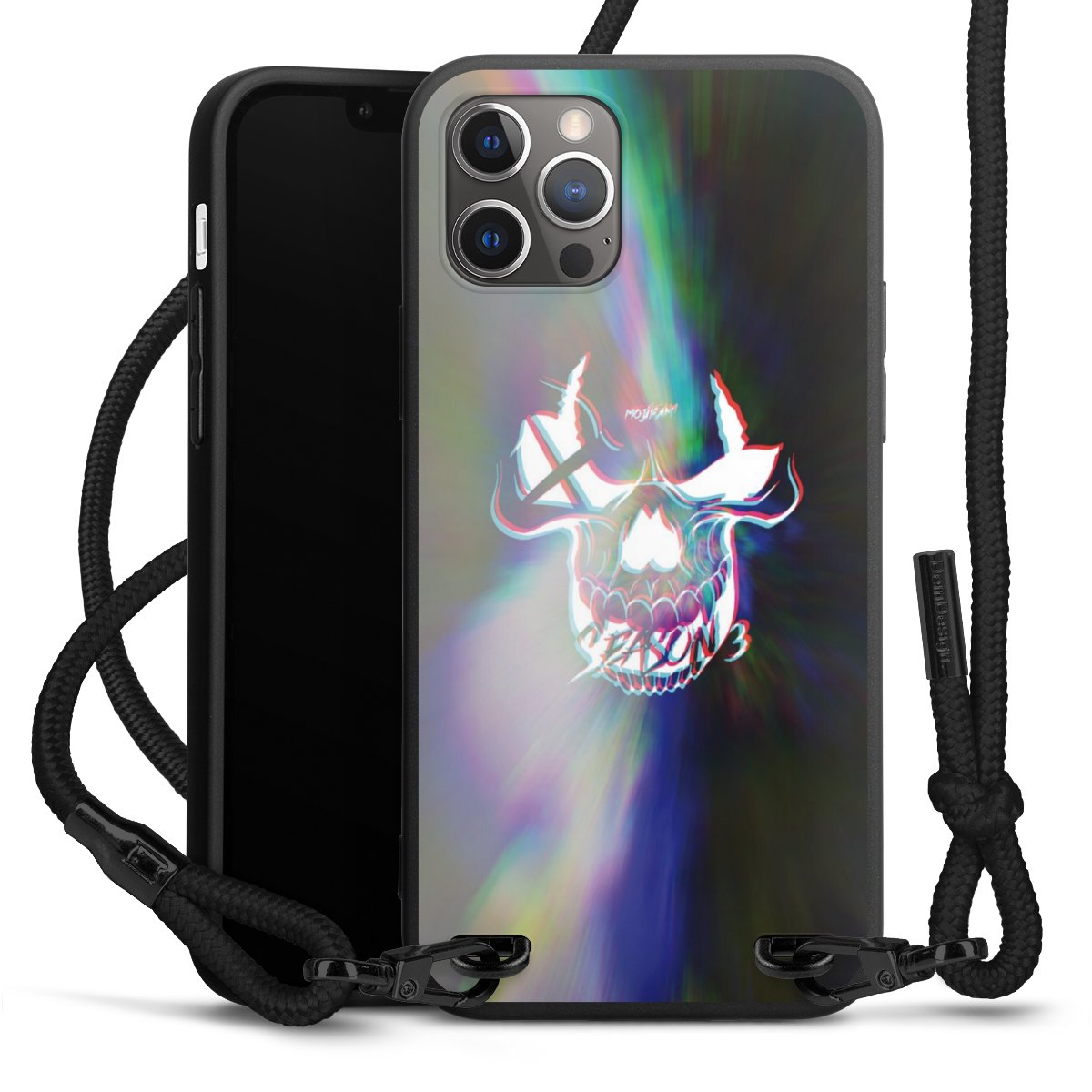 Pure Black: Handyhülle, Stoffband und Metalldetails in stylischem Mattschwarz.
