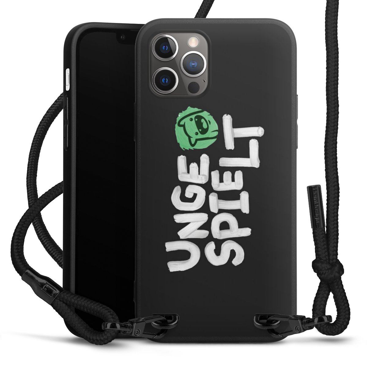 Pure Black: Handyhülle, Stoffband und Metalldetails in stylischem Mattschwarz.