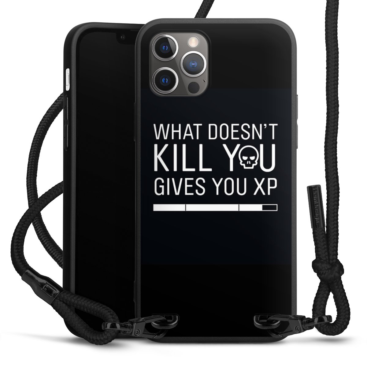 Pure Black: Handyhülle, Stoffband und Metalldetails in stylischem Mattschwarz.