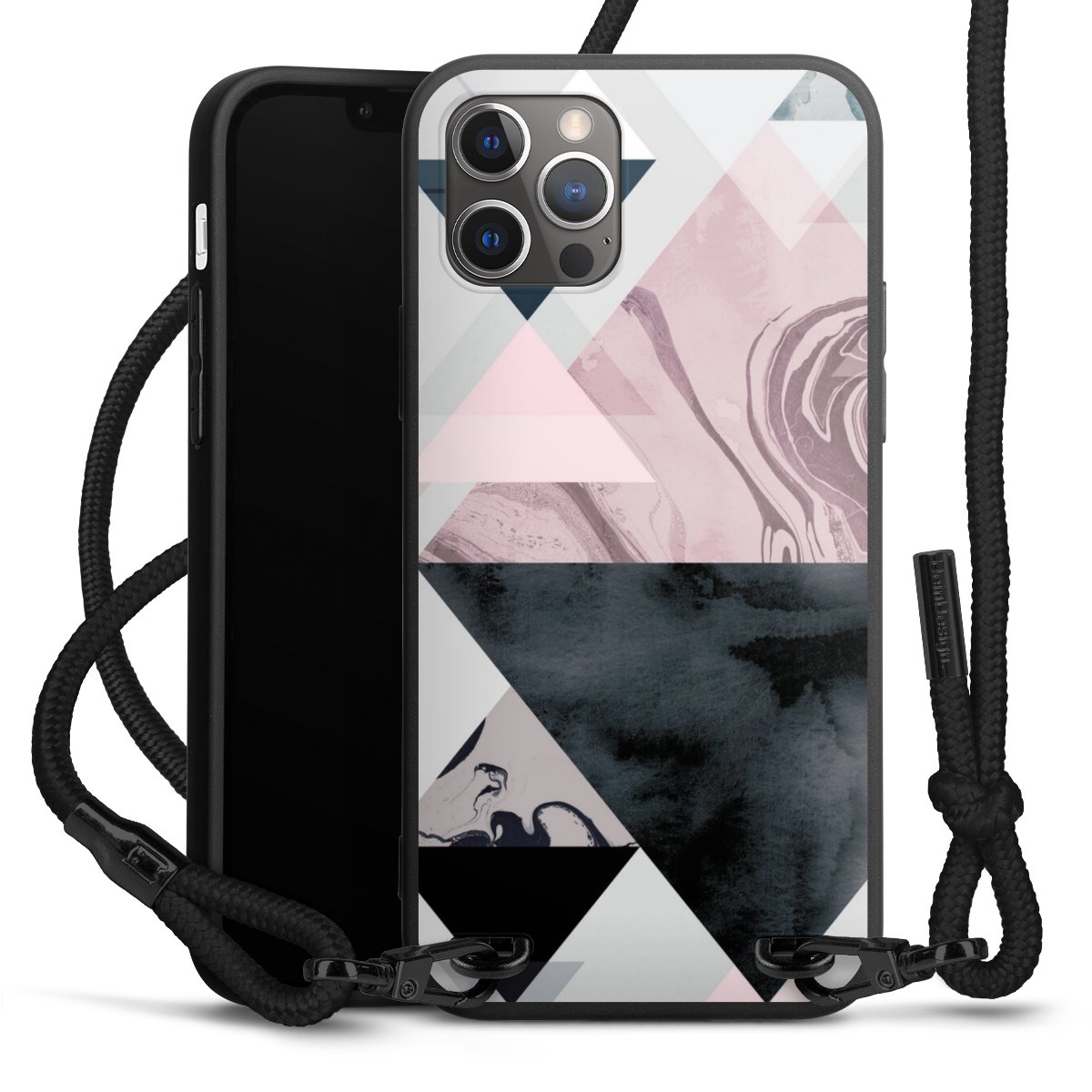Pure Black: Handyhülle, Stoffband und Metalldetails in stylischem Mattschwarz.