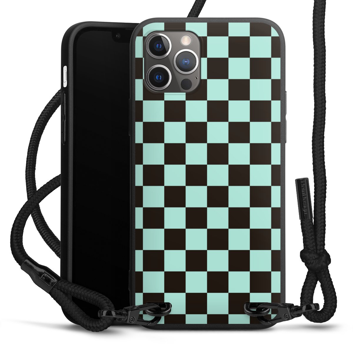 Pure Black: Handyhülle, Stoffband und Metalldetails in stylischem Mattschwarz.